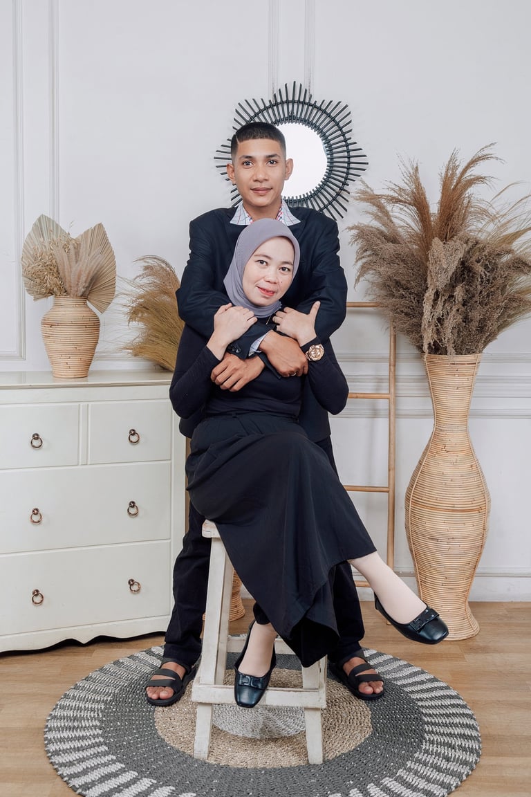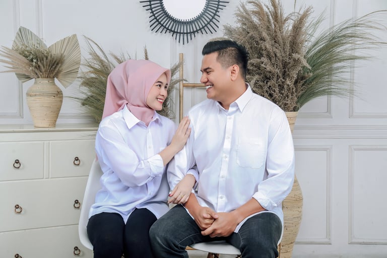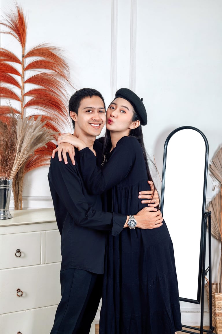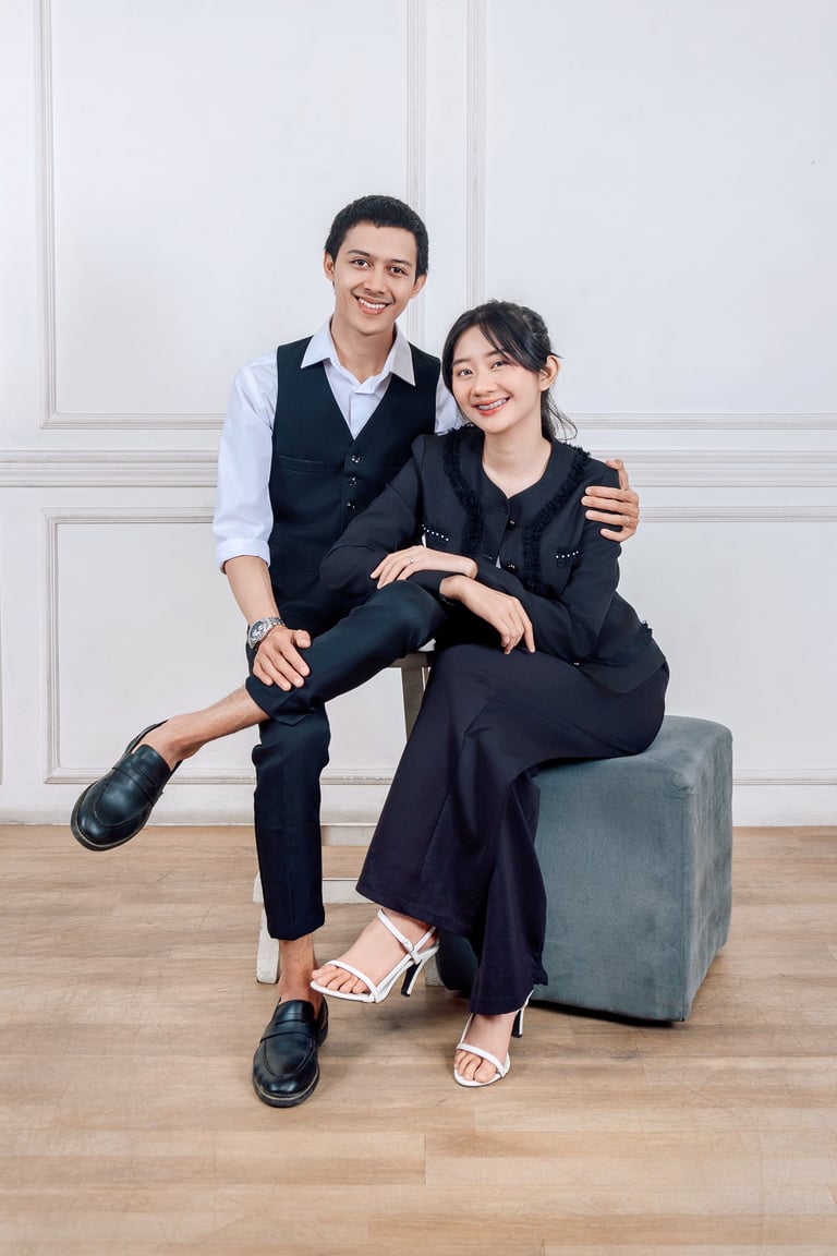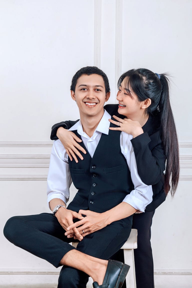 Foto studio couple umumnya menggambarkan momen kebersamaan dan keintiman pasangan yang diabadikan di dalam studio foto.